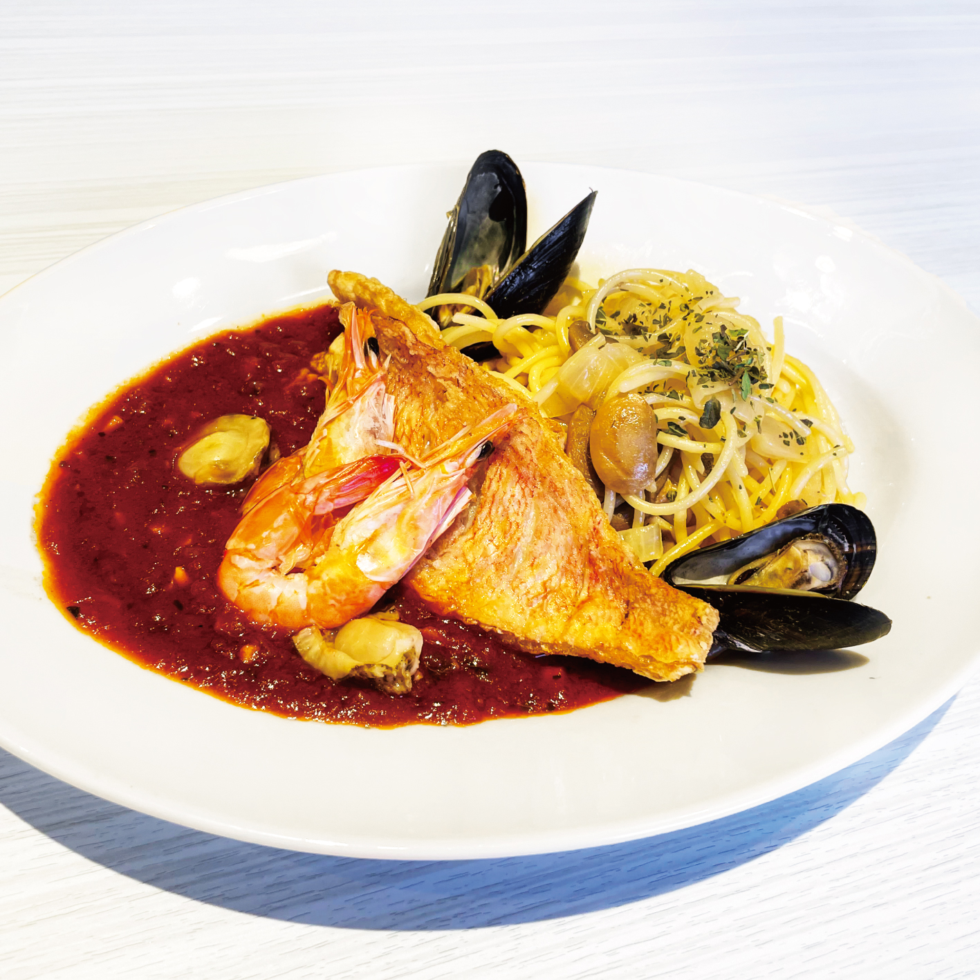 エビ・ムール貝・ホタテを、アンチョビとハーブを効かせた濃厚なトマトソースで煮込みました。魚介の旨みが